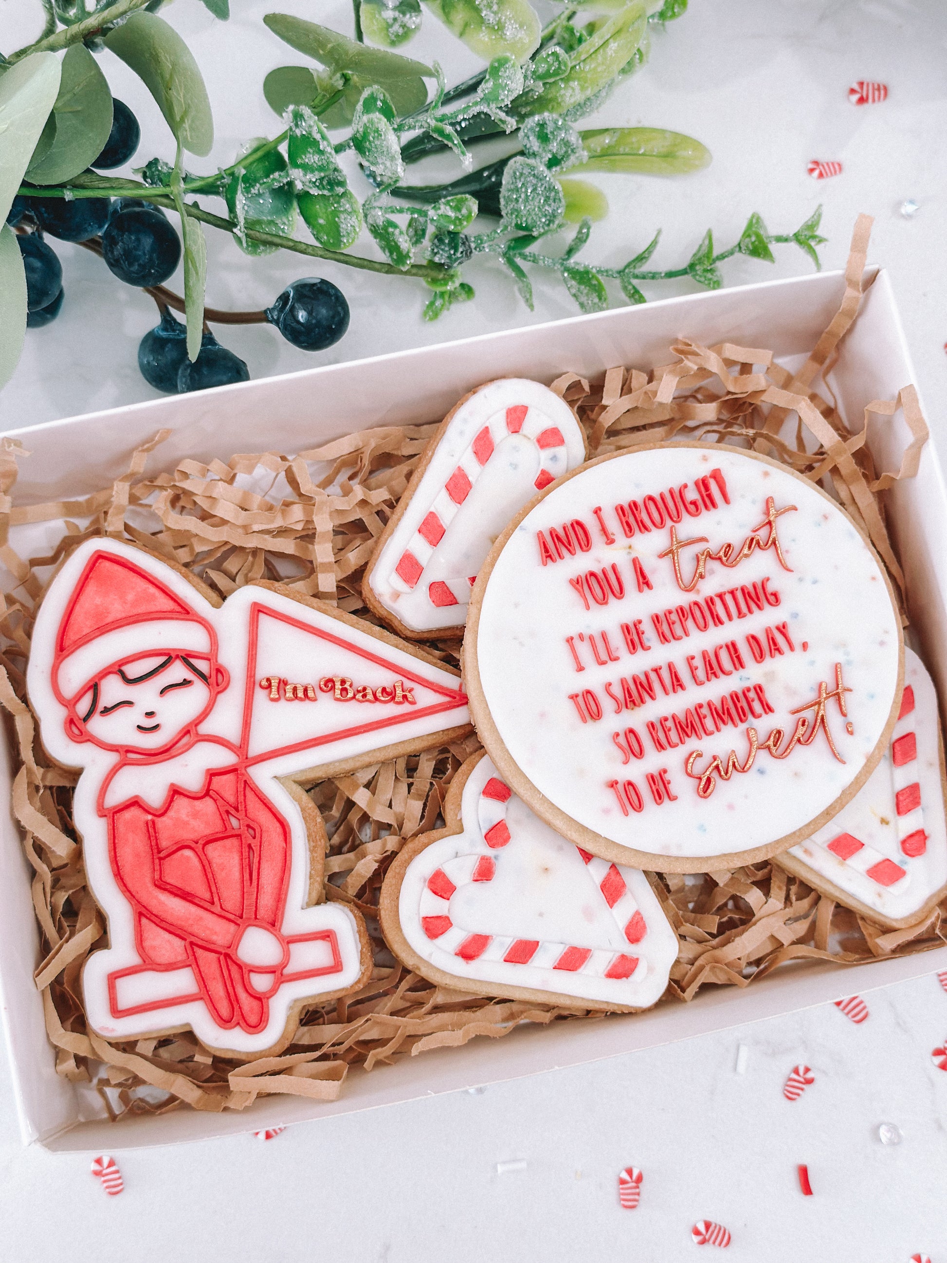 Add to the magic that the Elf On The Shelf brings and let your family Elf arrive with a box of "I'm Back" cookies, with the cutest little "Sweet Treat" verse.