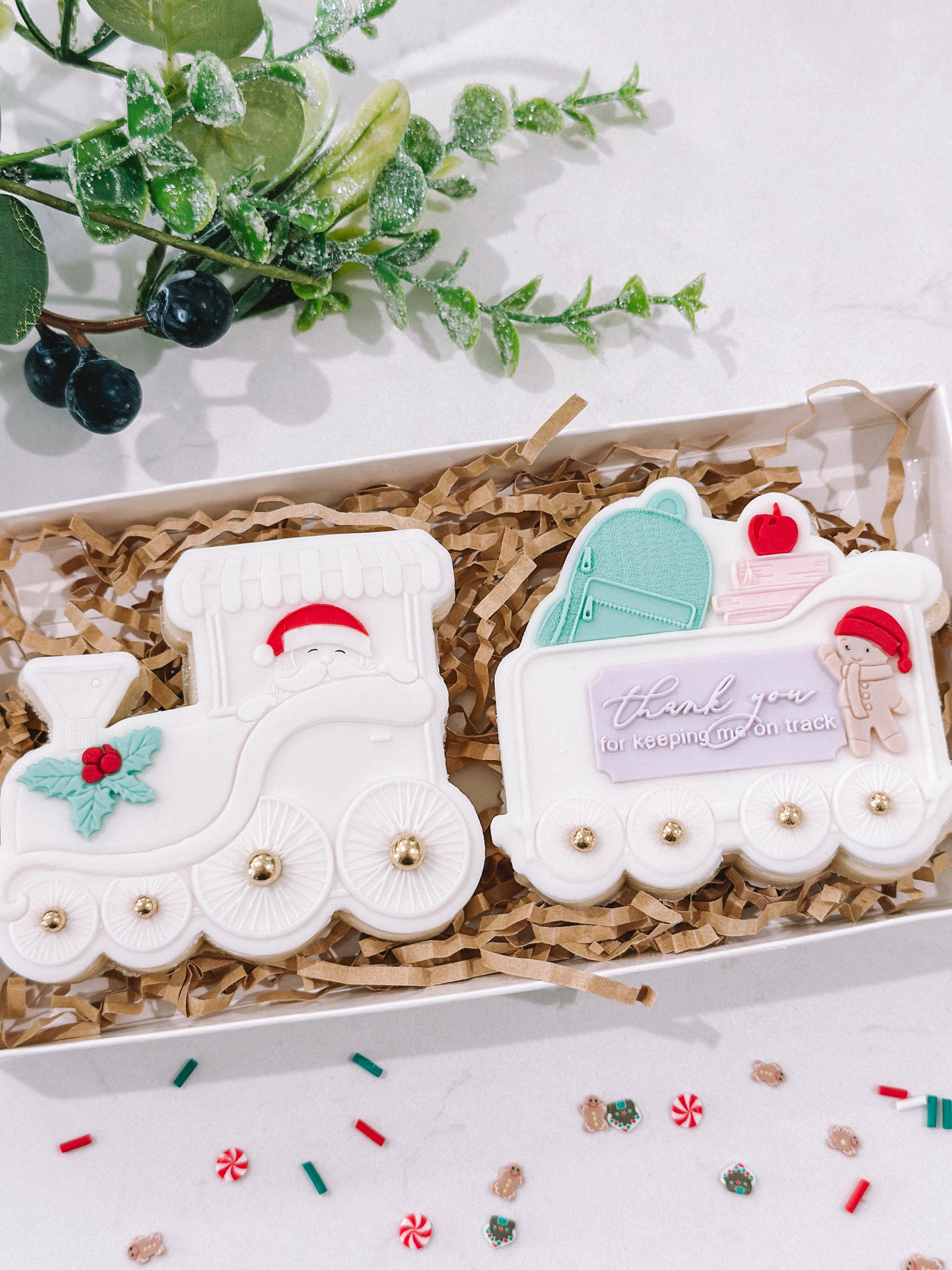 Pack includes 2 vanilla bean sugar cookies as pictured, decorated with fondant details. The cookies are packaged in a white gift box with a clear lid & ribbon bow.